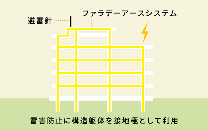 ビル全体で落雷からIT機器を守る強い建物を実現。ファラデーアースシステム(統合接地)によって落雷時の電位発生を防止し、ノイズ障害から機器を守ります。