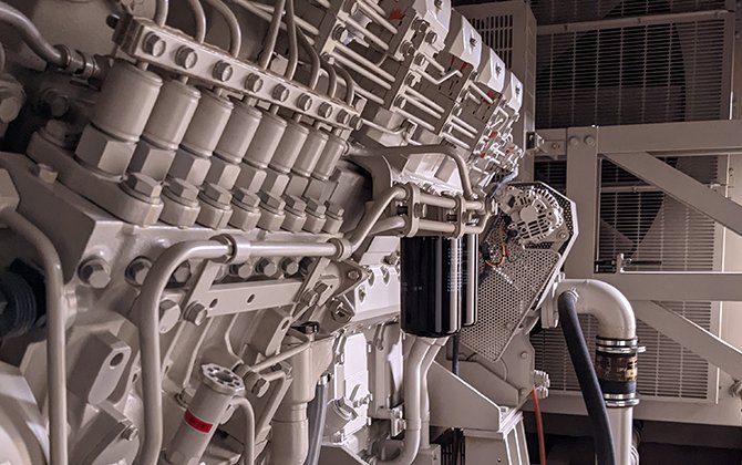 停電時に瞬時に起動する非常用自家発電機(N+1) 。データセンター内には、72 時間継続運転可能な燃料を備蓄しております。更に、外部には+24時間分の燃料を備えており継続運転が可能です。