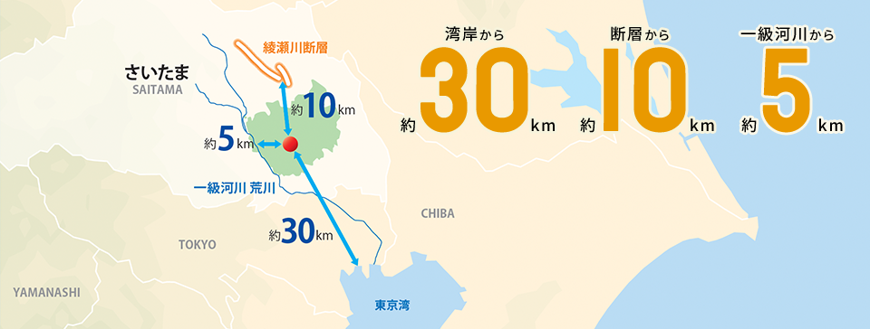 さいたま市の水害ハザードマップ外の環境。標高26mに位置しているため、台風、ゲリラ豪雨といった集中豪雨発生時にも安心の立地。