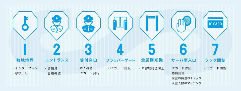 ビル入館からラック開錠まで、7箇所のセキュリティゲートを設置。